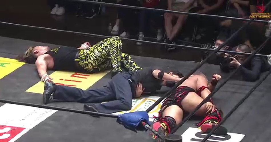 そこでフジイがバリカンを持ち出して斎了レフェリーが止めようとするが、フジイは斎了レフェリーの頭を刈ろうとする。斎了レフェリーにバリカンは取り上げられたフジイはダイヤに逆水平の連打も、ダイヤは低空ドロップキックを連発してフジイを場外へ追いやると、ラ・ケブラータを命中させたがH・Y・Oが乱入してダイヤを襲撃する。