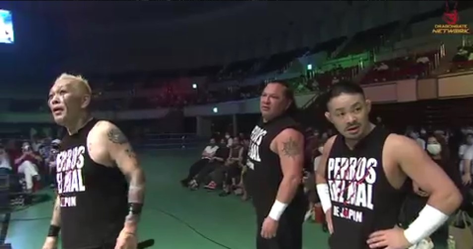 PERROS DEL MAL DE JAPONは襲撃で開始となると、場外戦ではEitaがウルティモに鉄柱攻撃からサミング、NOSAWAとEitaがサントを痛めつけてマスクを剥ぎにかかる。ウルティモがカットに入るが、場外戦になるとPERROS DEL MAL DE JAPONはレジェンドコンビを痛めつけて試合をリードする。