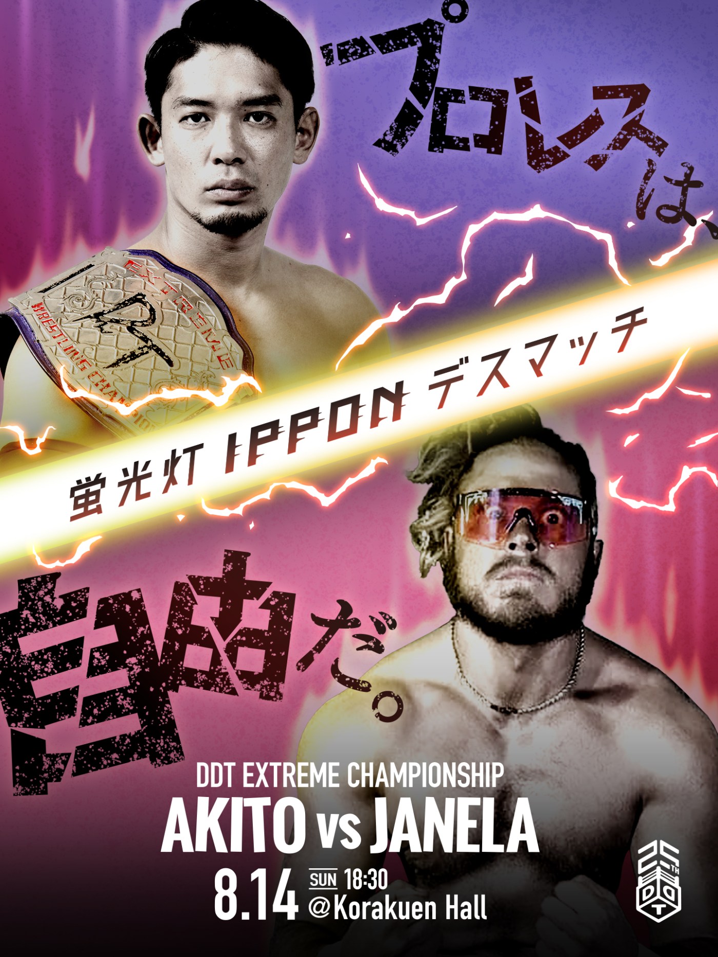 セミファイナルではDDT EXTREME選手権が行われ、王者の彰人にGCWからの刺客ジャネラが挑戦、試合形式はリング上に蛍光灯が1本用意され、それを割った選手が敗者となる、蛍光灯IPPONデスマッチになり、彰人は朱崇花相手に行って破っている。