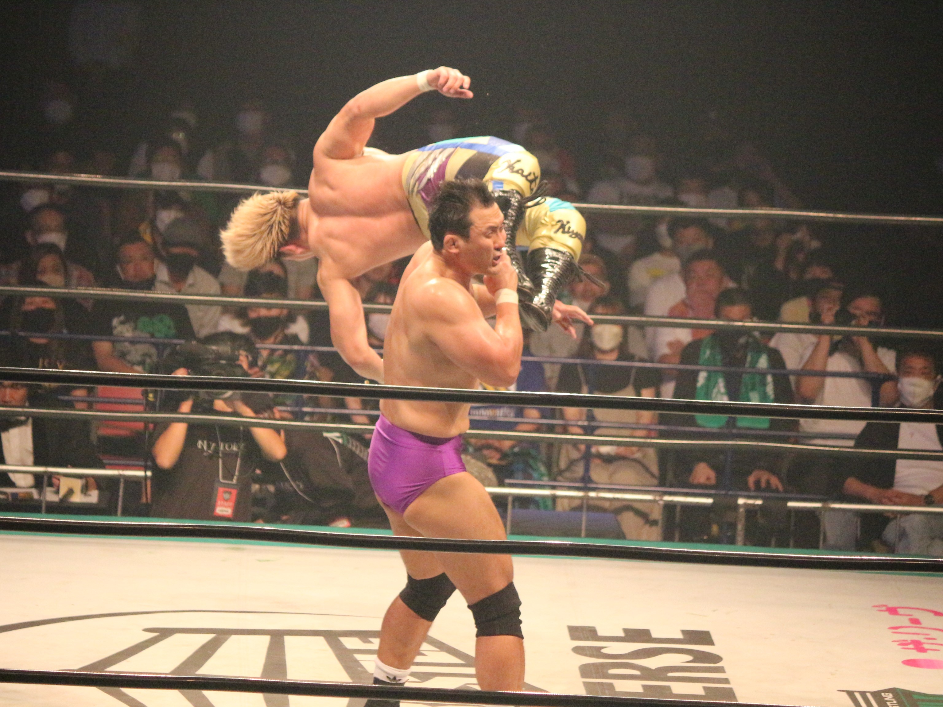 リングに戻った清宮はジャーマンスープレックスホールド、タイガースープレックスを狙うが、逃れた鈴木はエクスプロイダーに対し、清宮はジャーマンで応戦、エルボーからエルボースマッシュのラリーになると、鈴木が強烈なカウンターエルボーを浴びせ、清宮の串刺しジャンピングニーをキャッチして叩きつける。