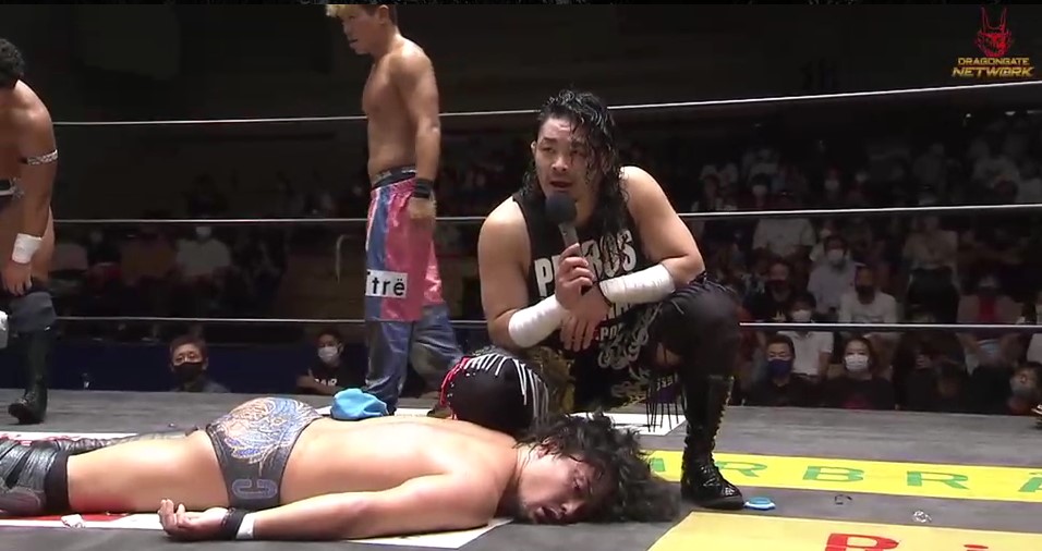 菊田が止めに入ってEitaがやっとNumero Unoを解くと、吉岡は失神状態、そこでEitaが「自分で負けを認めた吉岡はみじめ」として詰って蹴り「後楽園に客が入ってない、DRAGON GATEがつまらない、吉岡がチャンピオンだからだ、客を入れて見ろ!オレを熱くさせろ」と言い放って退場すると、その言葉が響いたのか、KAMEIもジェイソンも笑みがないまま退場する。