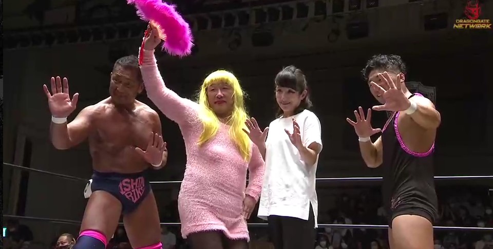 試合後に偉進は飯橋親子でトライアングル王座に挑戦を表明すると、マサアキは「あと一人はどうするんだ。お母さんでも連れてくるか」と言い放ったところで、元LLPWの女子プロレスラーで維新力の婦人であり、偉進の母である穂積詩子さんが登場、詩子さんはマサアキとはWAR時代から親しい関係ということでプライベートの話を出しつつ、引退して30年ということで丁重に断ると、代わりに妹を紹介するとして出てきたのは、ジュリアナの衣装を着たドン・フジイに似ているフジ子さんが登場、フジ子さんは「高いところから失礼するわよ」と挨拶すると望月親子はずっこけてしまう。