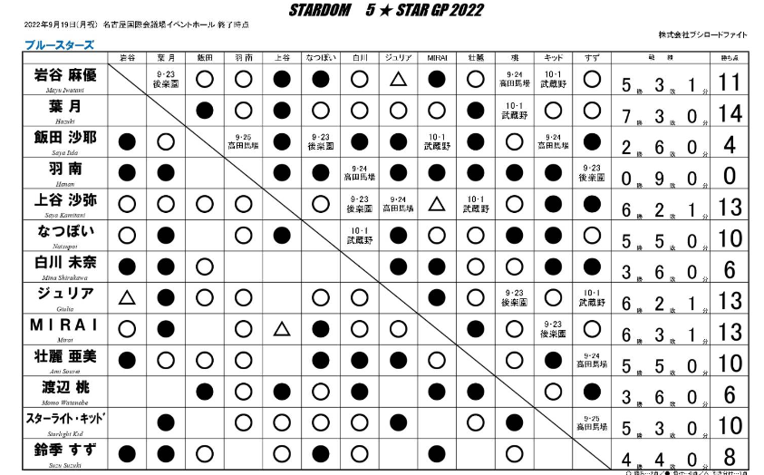 そして後楽園大会を終えた時点でのリーグ戦はレッドスターズが中野、AZM、舞華、朱里が14点で並び、ブルースターズは葉月のトップは変わらずも上谷、MIRAI、ジュリア、岩谷が追いかける展開となった。