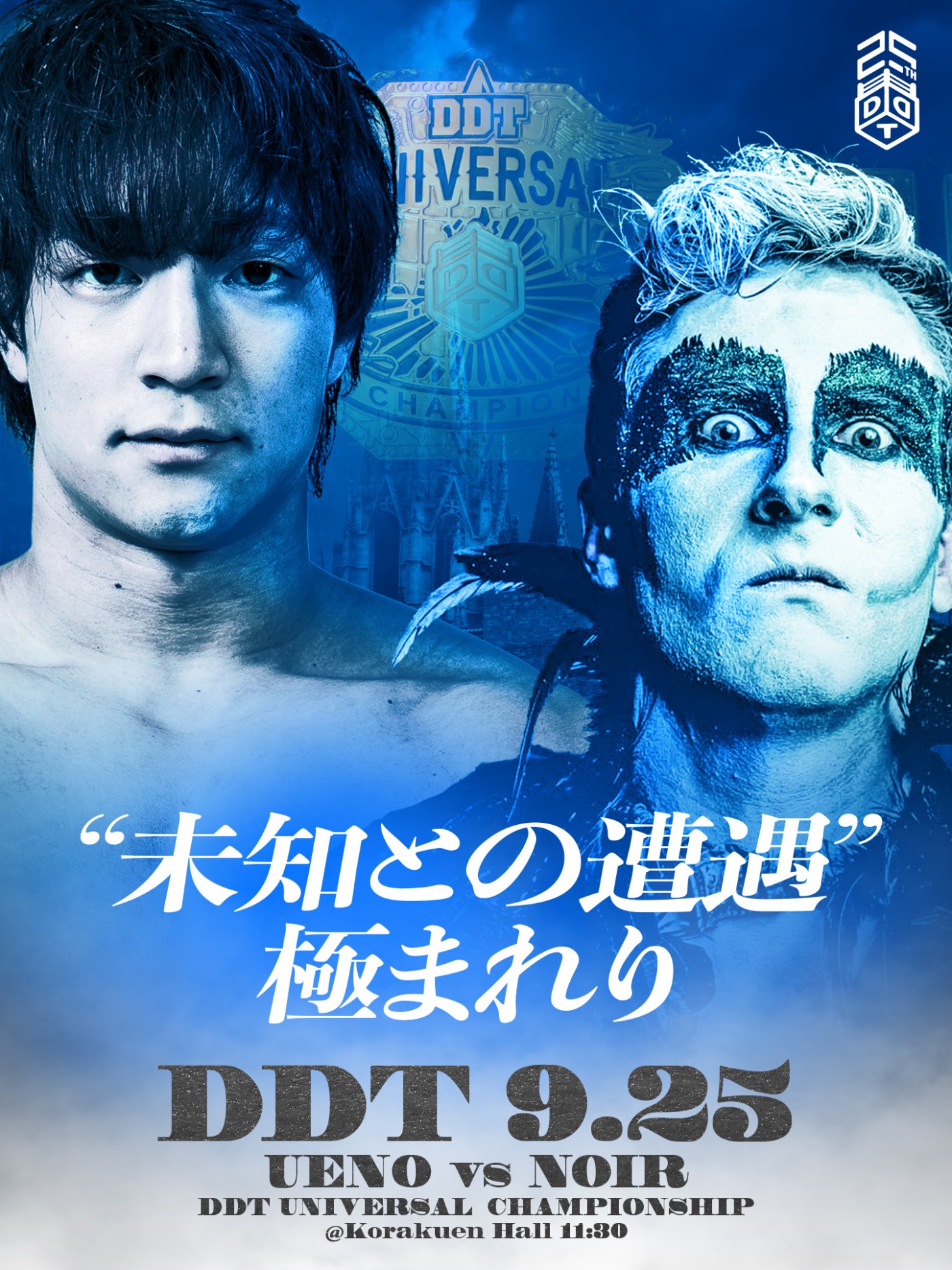 DDT後楽園大会のセミではDDT UNIVERSAL選手権が行われ、王者の上野にノワールが挑戦した。開始からノワールが指を出したのに対し、上野は熱波パワーポーズで牽制したすると、いきなりノワールがジョンウーを放ってからジャーマン、ラリアットで上野を場外へ出してスライディングキックと奇襲をかけ。リングに戻ると上野の腰へのニー、コーナーパットに叩きつけて逆水平、エルボーの連打からコーナーへハンマースルーと一気に先手を奪う。