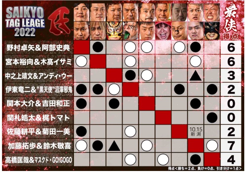 【2勝1分₌5点】〇竹田誠志 塚本拓海(15分43秒 片エビ固め)【4勝1敗₌8点】アブドーラ・小林 ×若松大樹