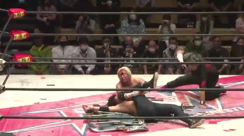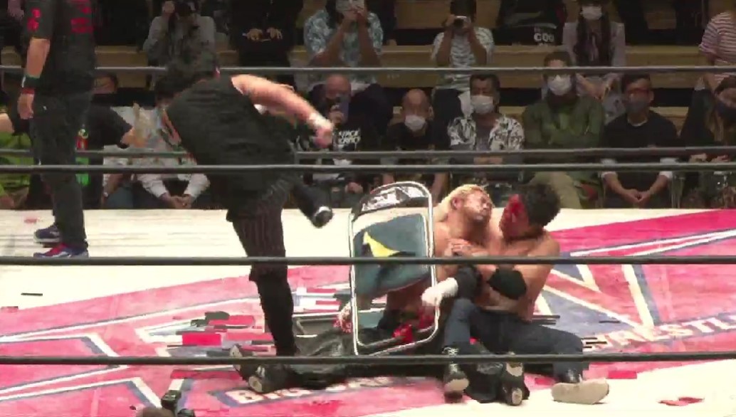 永尾に代わると影山にマシンガンエルボーを乱打、串刺しジャンピングエルボーからブレーンバスターで投げるとマウントエルボーを乱打、和樹が入ると永尾が河津掛けから影山にイスを添えると、和樹が、永尾が卍固めで捕らえ、優作がカットに入るが、和樹がイスでフルスイングで排除する。