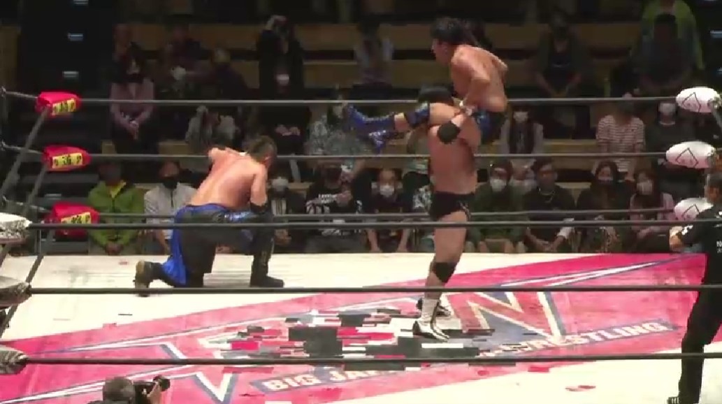 長時間捕まった青木は大地にドラゴンスクリューを決めると、代わった入江に大地がソバットも入江はショルダータックルを浴びせ、神谷が入っても大神の連係を阻止し、神谷の上へ大地をパイルドライバーで突き刺す。