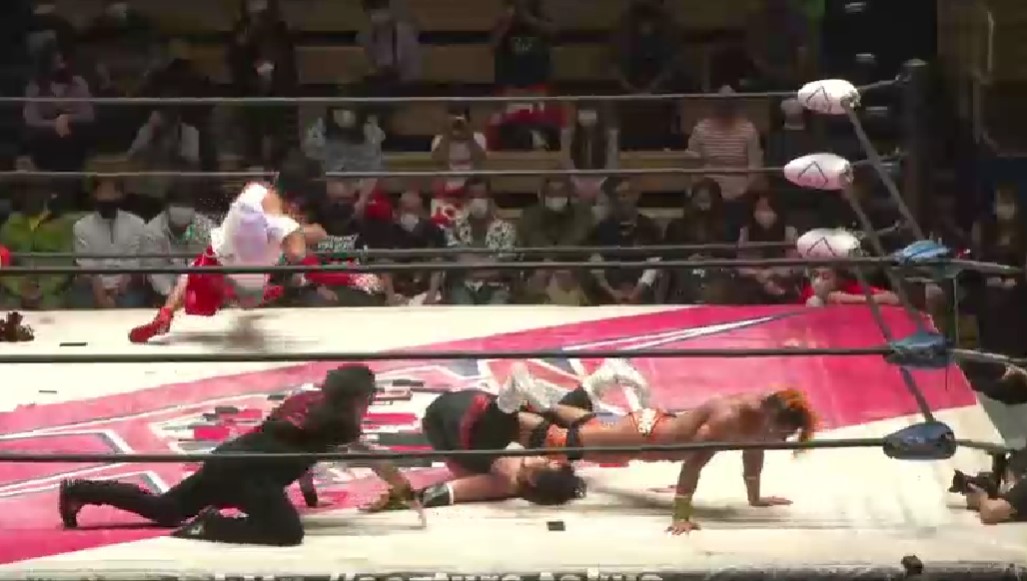 イサミはブレーンバスターは切り返した関札がバッククラッカー、梶が入ってダブル串刺しバックエルボーからダブルマッケンローと合体技を連発。イサミのクロスボディーもキャッチすると崩れてしまうと、宮本がハンドスプリングオーバーヘッドキックからファイヤーサンダーは関札が着地、しかし試合権利があったのはイサミで関札をボディーシザースで捕らえて追い詰めにかかるが、関札は必死でロープエスケープする。