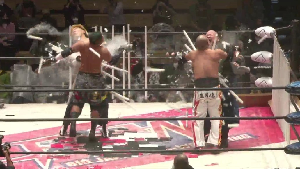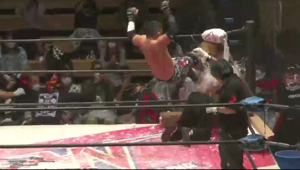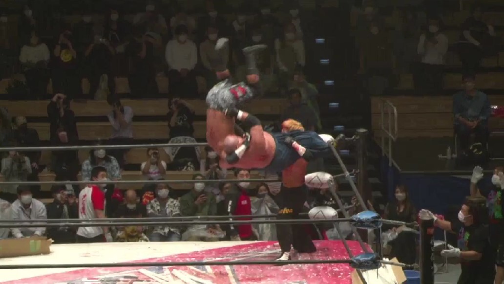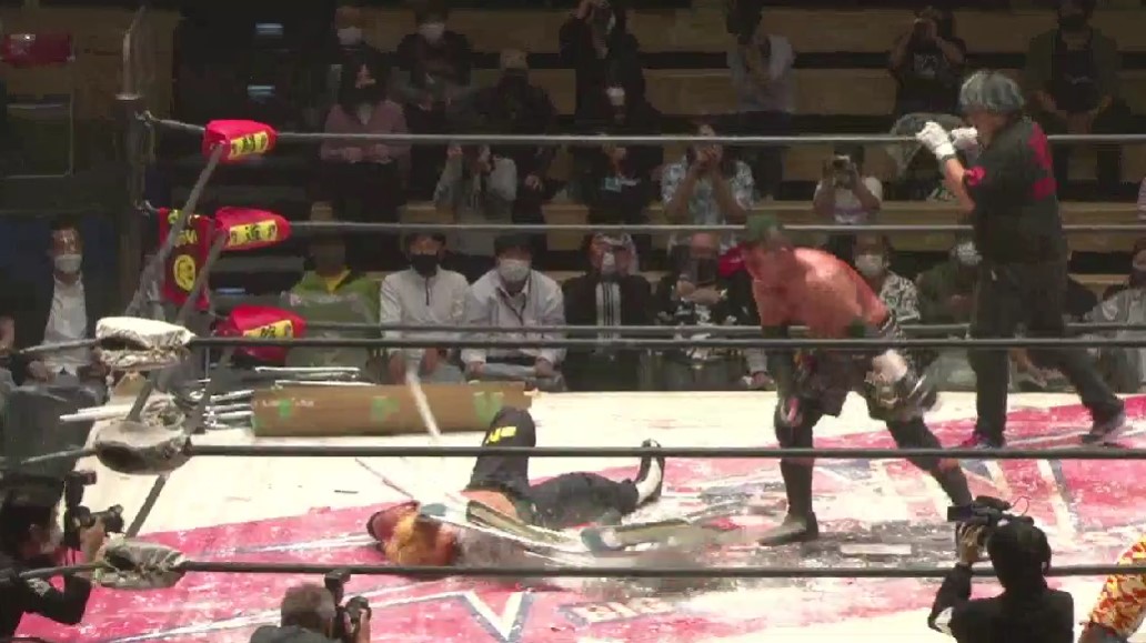 若松が竹田にミサイルキックを命中させ、竹田に蛍光灯束をセットしてからバカチンガーサマーソルトドロップ、ジャーマンスープレックスホールドと畳みかけるが、塚本がカット、ドラゴンスープレックスは竹田が逃れてエルボーのラリーに持ち込み、頭突きのラリーから、若松の蛍光灯束でのフルスイングは竹田がバックスピンエルボーでクラッシュさせる。