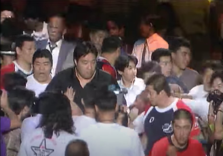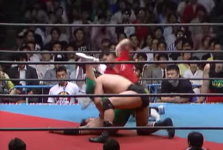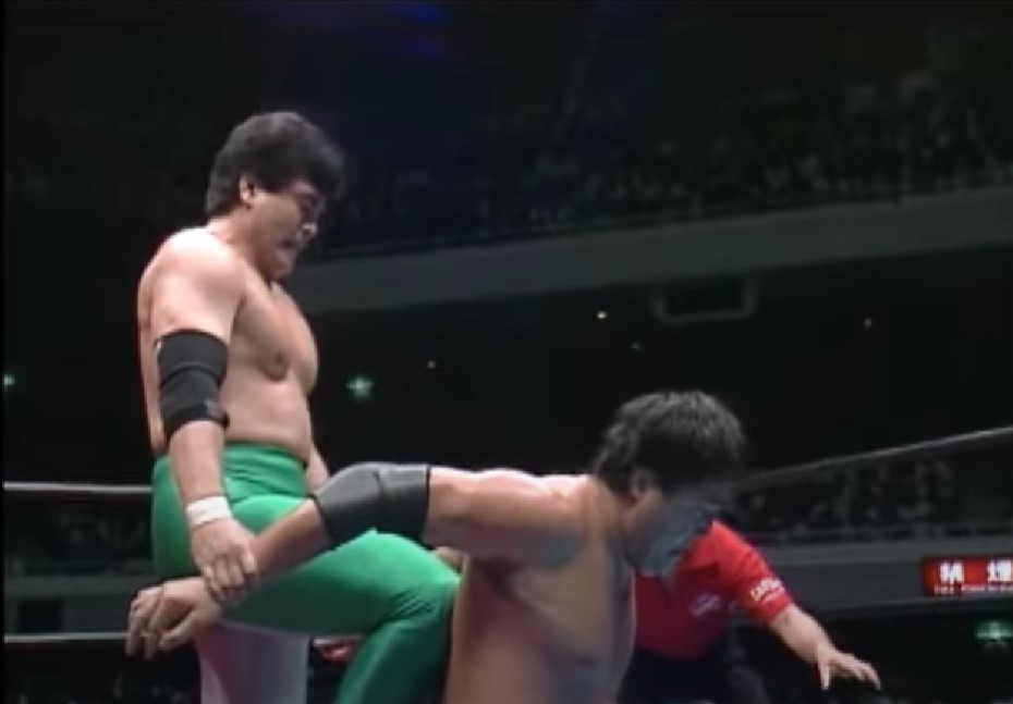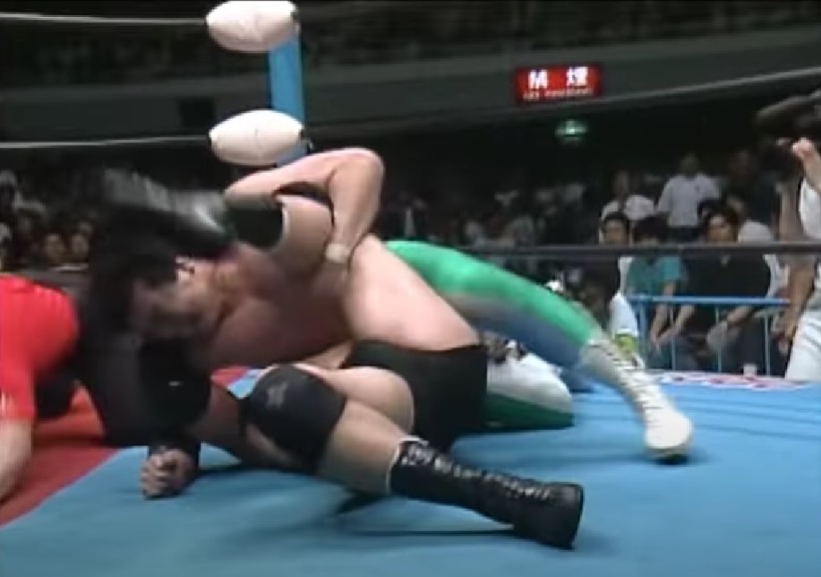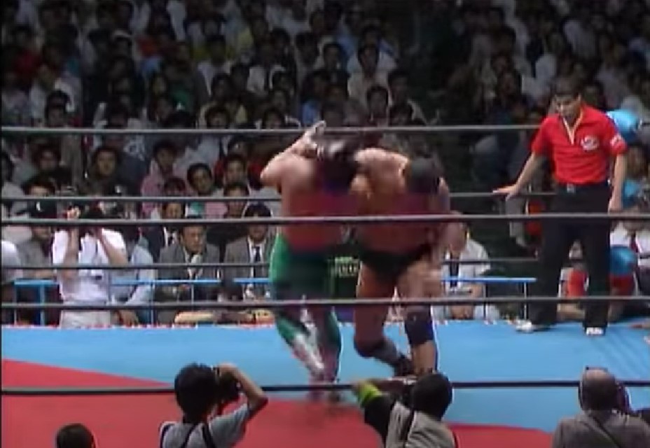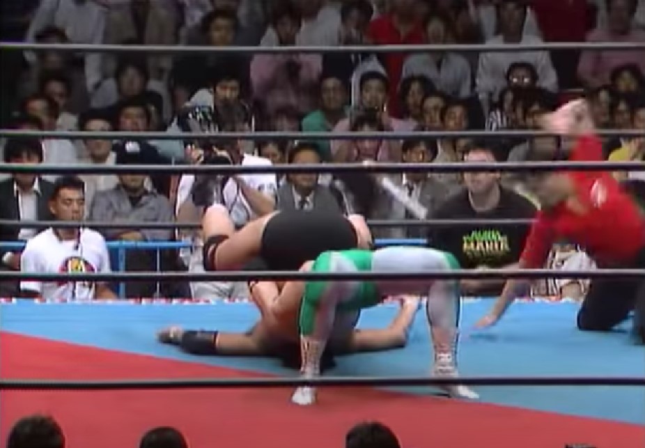 鶴田はエルボーアタックを狙う三沢を叩き落すが、ドロップキックで反撃した三沢はエルボーからミサイルキック、串刺しバックハンドエルボー、サイドスープレックス、スピンキックと畳みかけてからフロッグスプラッシュを投下、しかしクロスボディーは鶴田にキャッチされ、トップロープにノドを直撃させてしまい、鶴田はパイルドライバーで突き刺すからフライングボディーシザースドロップからニードロップを連発、ドロップキック、カウンターキック、セカンドロープからのジャンピングニー、トップロープからのダイビングニー、パワーボムと攻勢をかける。