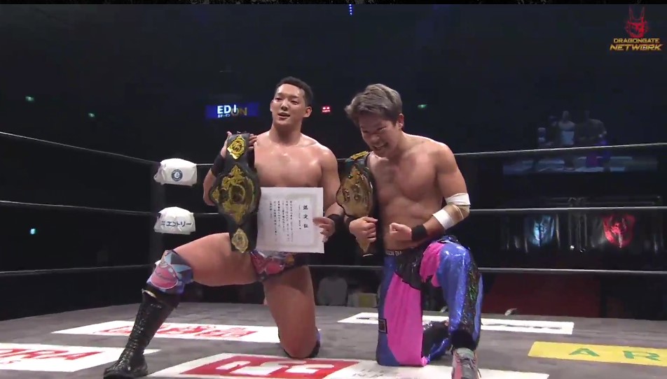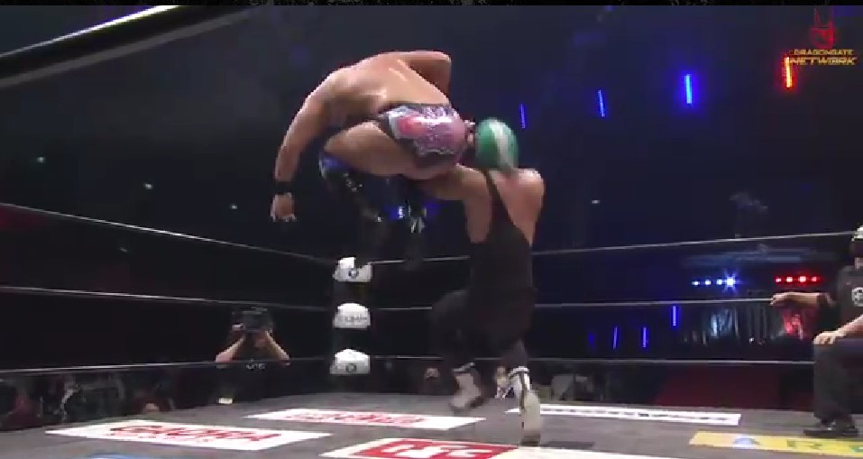 長時間捕まったダイヤは痛めている左肘を狙われるも、清水に串刺しを避けたダイヤがシザースホイップから菊田に代わり、挑戦者組の連係を菊田が尻爆弾で阻止すると、マシーンJにブレーンバスターからレッグドロップを投下すると、ダイヤがその飛びシューティングスターで続くが、清水がカットには入り王者組にワンタックルを浴びせ、挑戦者組が連係で菊田を捕らえる、ダイヤがカットに入っても、清水の無双から合体ハンマーロックネックブリーカーを決める。