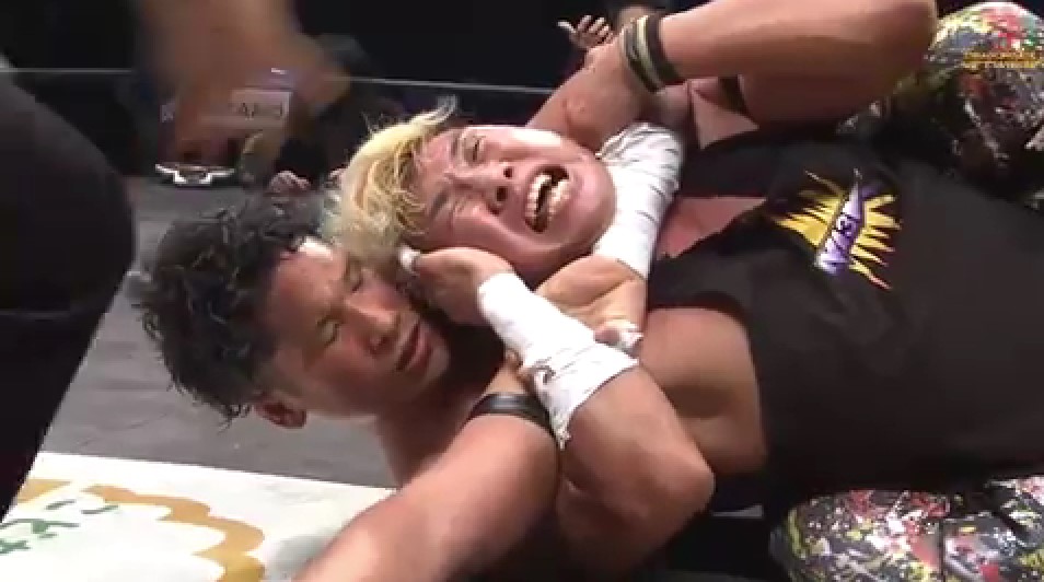 吉岡は串刺しエルボーを浴びせると、YAMATOの膝裏を蹴って倒してから脇腹へニードロップ、バックドロップはYAMATOが逃れるとgo to HospitalⅡ!ロープに吉岡を貼り付けてからドラゴンスクリュー、アンクルホールドで捕らえてからニークラッシャーでマットへ叩きつける。