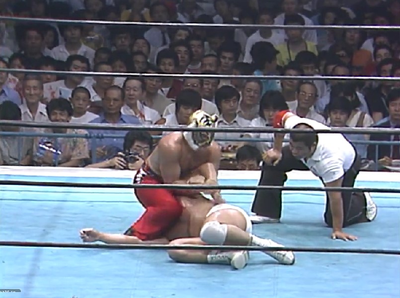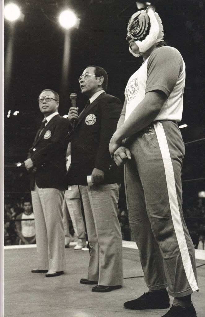 完全に不意打ちを食らった初代タイガーはエプロンに上がり、迫ってくる寺西にロープ越しの回転エビ固めで丸め込んで3カウントを奪い防衛も、寺西はカウント2でキックアウトしたとミスター高橋に抗議、小林もリングに上がって抗議する。そこで小林は初代タイガーに襲い掛かり、マスクを引き裂くと認定書まで破り捨て、立会人である新間寿氏からベルトを奪おうとする。