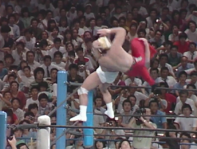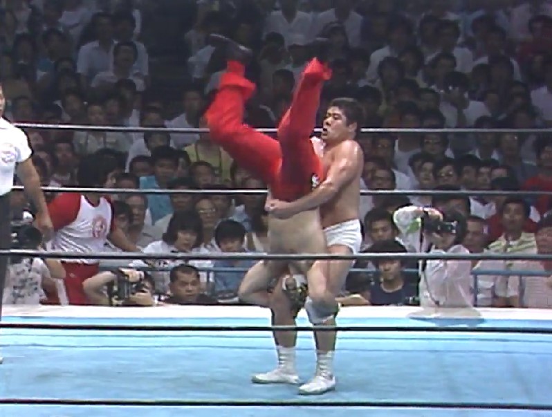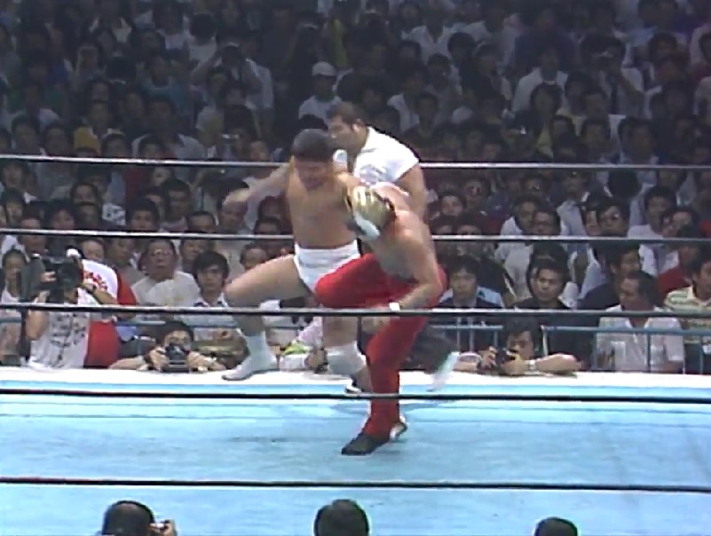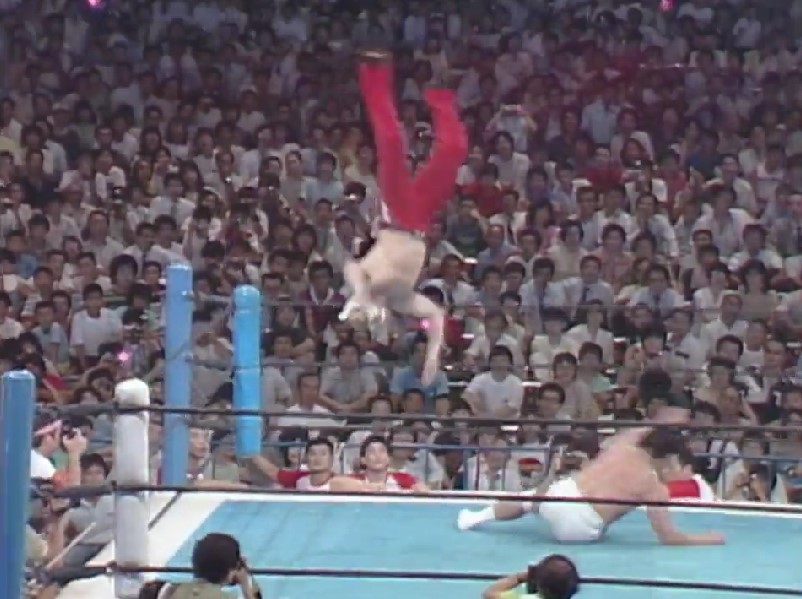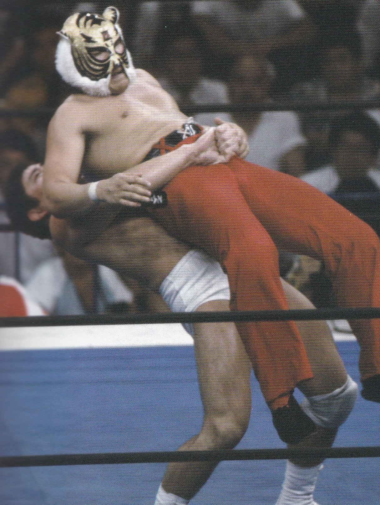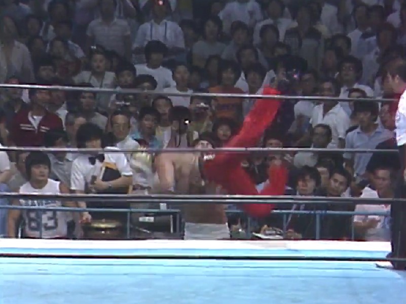 初代タイガーはヘッドロックも、ロープへ振った寺西はキチンシンク、ローリングクレイドルから前落とし、しかしヘッドロックで捕らえた寺西を初代タイガーはバックドロップからミサイルキックで場外へ出すとプランチャを命中させる。