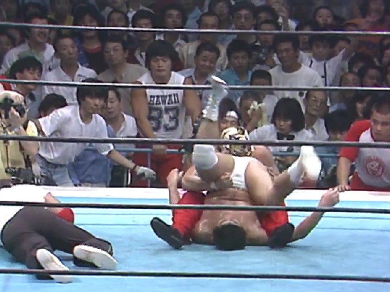 寺西は雪崩式バックフリップ、前落としと畳みかけると、コーナーからのダイブを狙ったが、初代タイガーがドロップキックで迎撃した際に、脚が寺西の股間に直撃するハプニングが起きて両者ダウンになる。