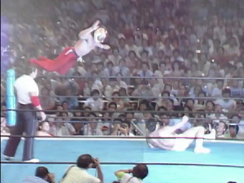 ところが先に立ったのは寺西で小林に背中を押されてリングに戻ると、初代タイガーは小林に気を取られてビンタを浴びせてからエプロンに上がったところで、寺西が背後からドロップキックで落とし、トップコーナーからプランチャスイシーダを命中させる。