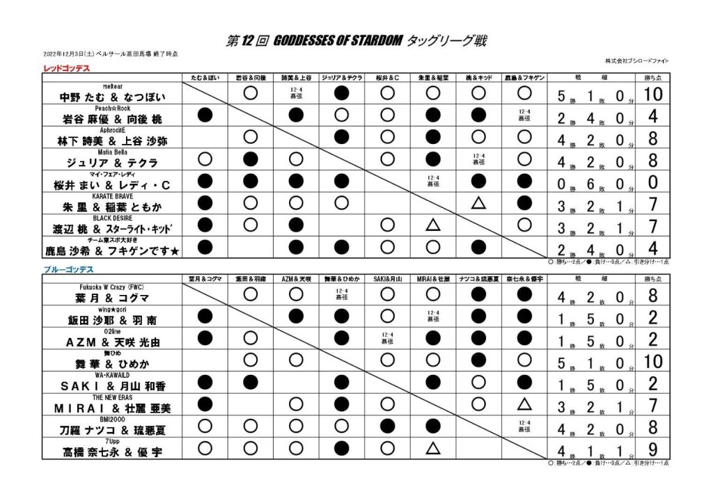 いよいよ最終公式戦と優勝決定戦を迎えた第12回 ゴッデス・オブ・スターダム~タッグリーグ、ここまでの経過を振り返ると、レッドゴッテスは中野&なつぽいのmeltearが単独トップで1敗差で詩美&上谷のAphroditE、ジュリア&テクラのマフィアベラが追いかけ、ブルーゴッテスは舞華&ひめかの舞ひめが単独トップ、1点差で奈七永&優宇の7UP、2点差で葉月&コグマのFWC、ナツコ&琉悪夏のBMI2022が追いかけるも、FWCがBMI2000、7UPとの直接対決で敗れていることから、舞ひめに勝ったとしても自力での優勝決定進出は出来ないという状況となった。