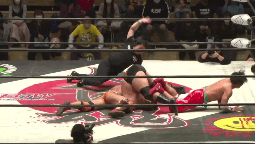 翔暉はラヴァーズをまとめてヘッドシザースホイップからドロップキックで反撃すると、代わった岡林が塚本にパワースラムで続き、塚本めがけて翔暉をボディースラムは避けられても、岡林が串刺しラリアットからブレーンバスターと攻め込み、アルゼンチンバックブリーカーを狙うが、塚本はノド輪で逃れて岡林を倒す。