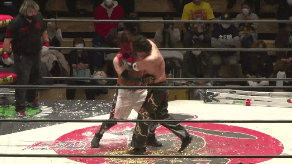 試合後には岡林からマイクを奪った翔暉はラヴァーズに初黒星を付けたことをアピールすると、岡林に優勝を呼びかけ、岡林も応じて握手し、岡林も翔暉だけでなくファンにも欠場を詫びつつ、優勝を宣言してビッサリで締めくくった。試合形式はハードコアルールだったが、ラヴァーズは敢えて相手側の土俵であるストロングBJのスタイルで臨んだが、さすがのラヴァーズも完全復活した岡林の前には適わなかったのかもしれない。