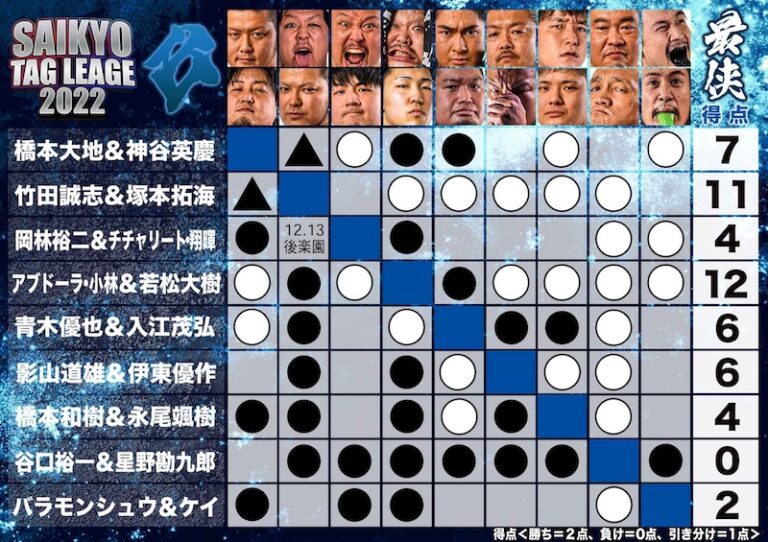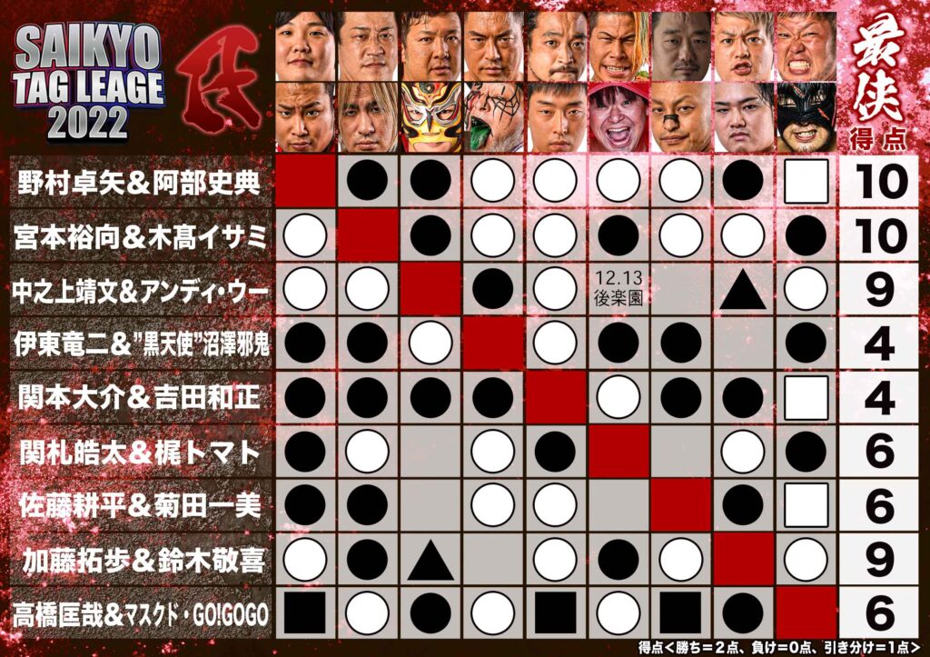 最侠タッグリーグ2022のここまでの経過は、Aブロックは宮本&イサミのヤンキー二丁拳銃と野村&阿部のアストロノーツはトップのまま全公式戦を終了、それを中之上&アンディ、加藤&鈴木のシラミティが追いかけ、Bブロックはアブ小&若松の流血無双がトップのまま全公式戦終了、それを竹田&塚本のクレイジーラヴァーズが追いかけるが、BブロックはAブロックと比べると公式戦を消化しておらず、まだまだ予断を許されない状況となっている。