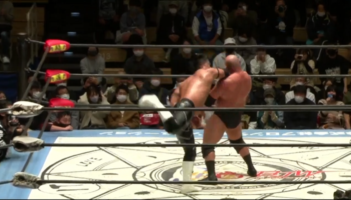 大門寺は下からアッパーカットが、岡林がショルダータックルからぶつかり合いは岡林が制して大門寺はたまらず場外へ逃れるも、追いかけた岡林が逆水平を連打からラリアットは鉄柱に誤爆すると、大門寺は岡林の左肩を鉄柱に叩きつける。