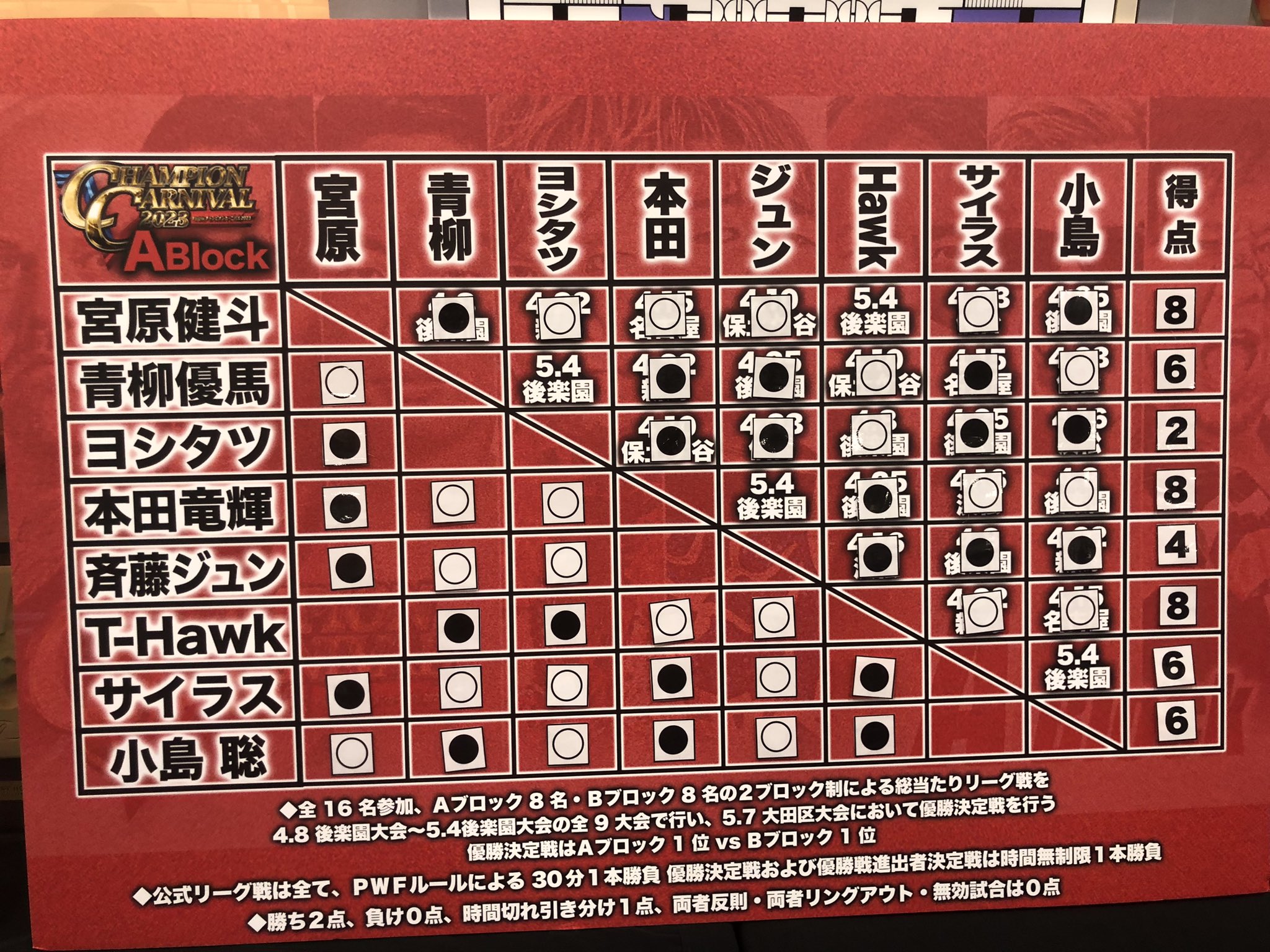 終盤戦を迎えた「チャンピオンカーニバル 2023」、ここまでの経過はAブロックは宮原と本田がトップで青柳とT-Hawkが追いかけ、Bブロックはレイが単独トップで諏訪魔、石川、芦野、征矢が追いかける展開となった。