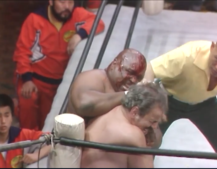 ここで開始のゴングが鳴るが、シークはブッチャーの額を凶器で刺しつつ噛みつき、また後頭部までも刺し、ブッチャーの頭部は血だらけとなり、ジョー樋口レフェリーも制止するが、シークはいうことを聞かず、凶器攻撃をやめようとしない。