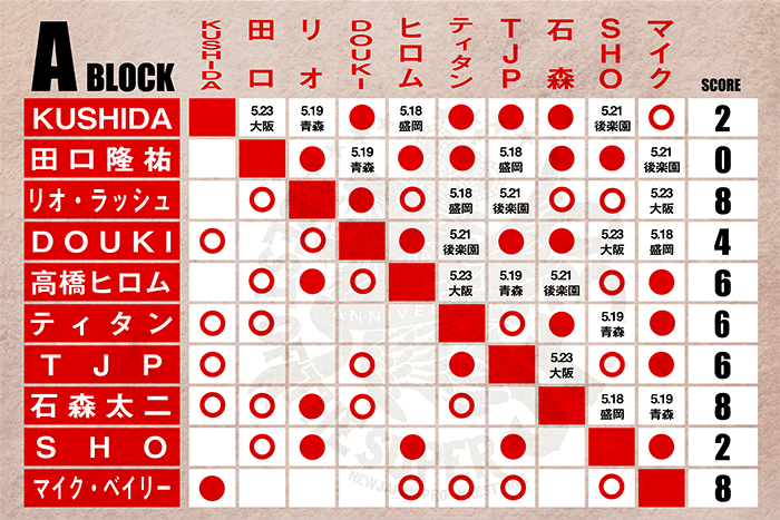 折り返し地点となる仙台大会を終えてからのAブロックの経過は、リオ、石森、ベイリーがトップグループで、ヒロム。ティタン、TJPが追いかける展開となった。