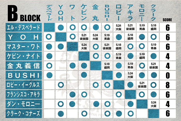 折り返し地点となる仙台大会を終えてからのBブロックの経過はロビーが単独トップに立ち、デスペラード、YOH、ワト、アキラ、コナーズが追いかける展開となった。