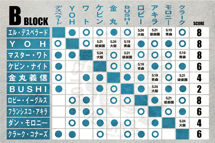 岩手大会を終えた時点でのBブロックの経過はデスペラード、YOH、ワト、ロビーが並ぶ混戦となり、ケビンとアキラ、コナーズが追いかける展開となった。