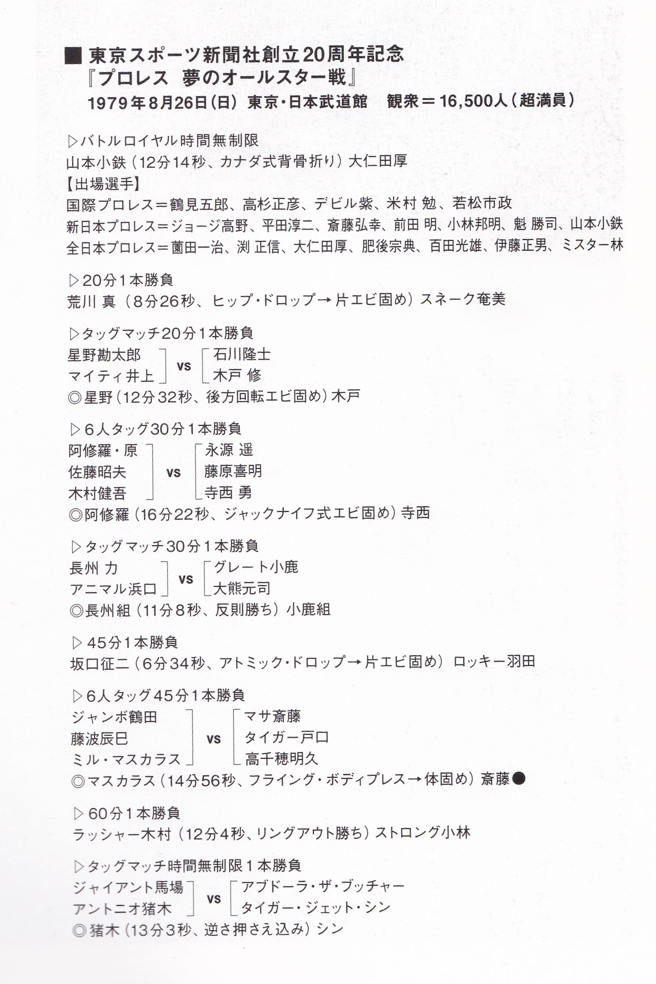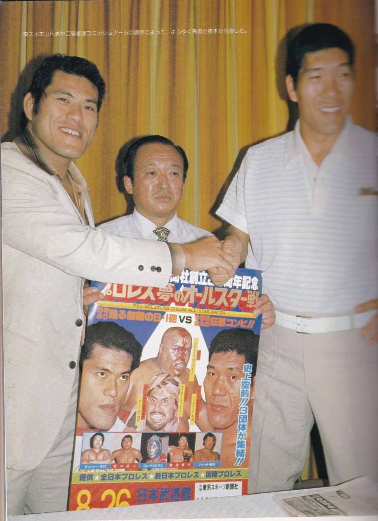 東京スポーツは創立20周年記念事業の一環として新日本プロレス、全日本プロレス、国際プロレスの三団体が揃う『プロレス夢のオールスター戦』は紆余曲折の末、ようやく開催が決まるも、一番難題だったのは対戦カード、マッチメークだった。