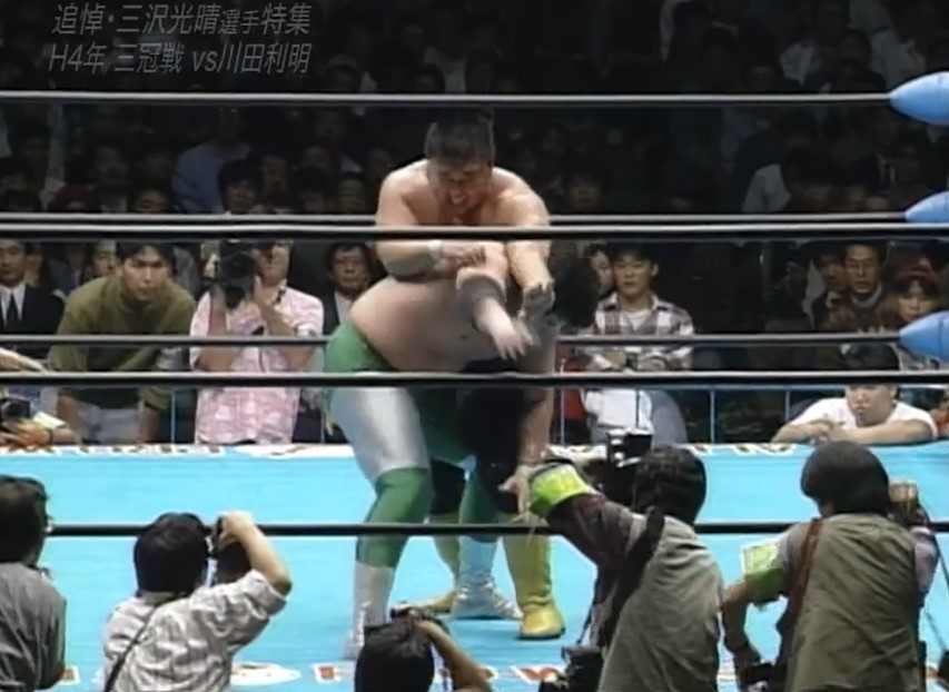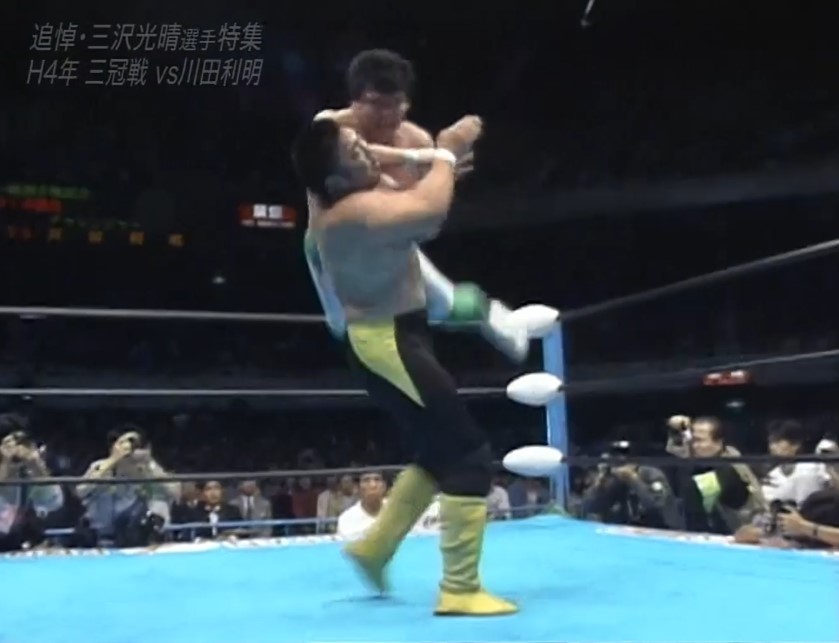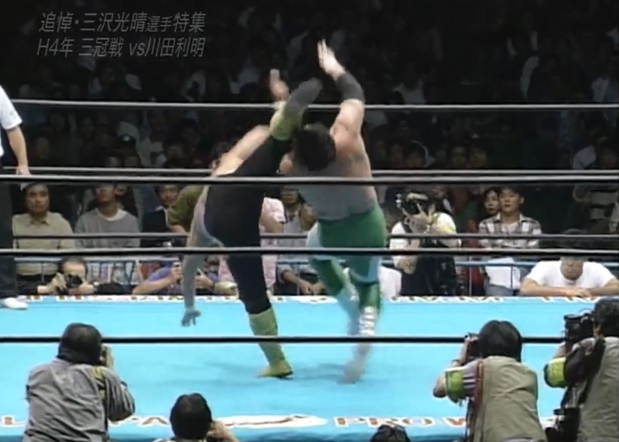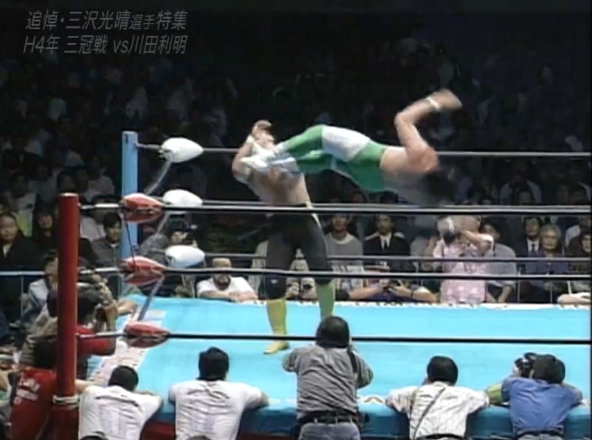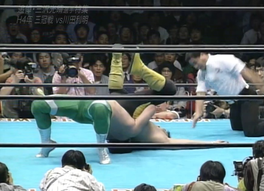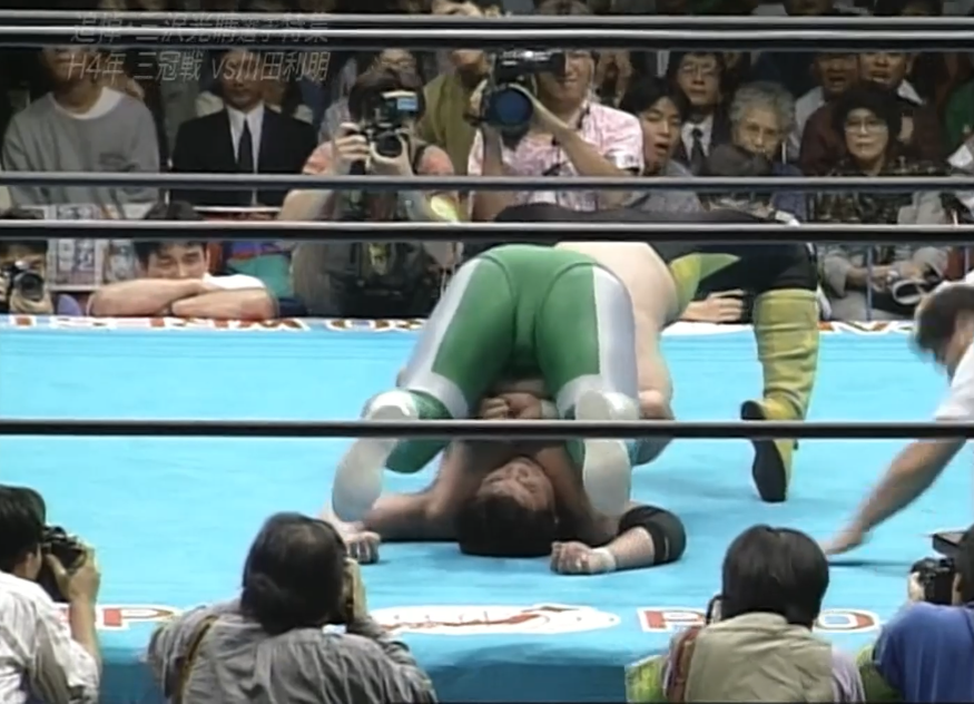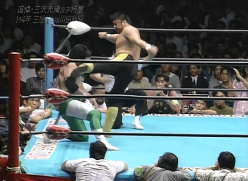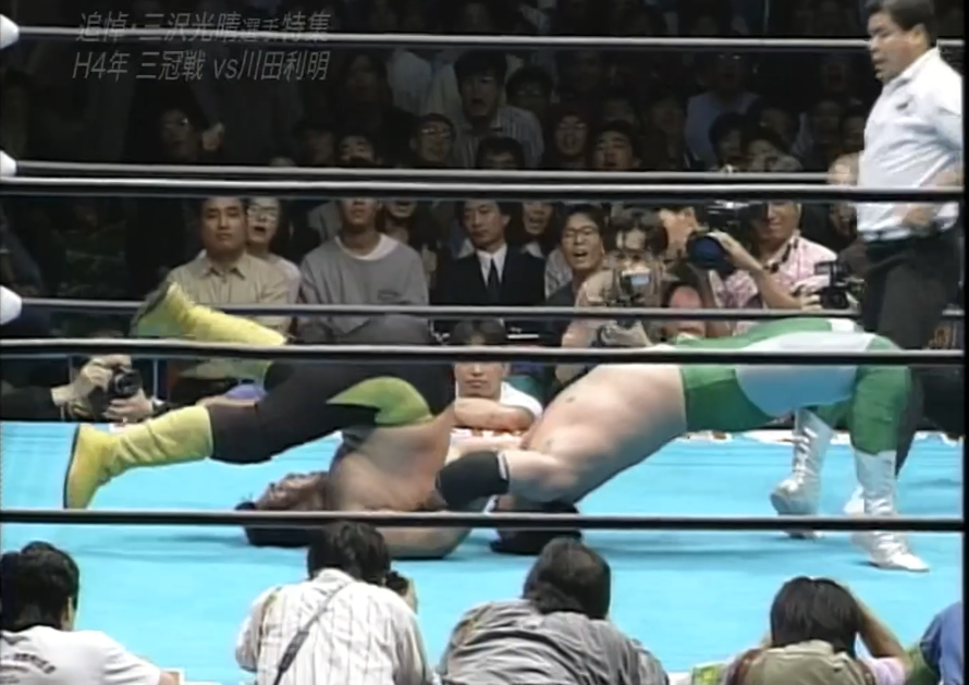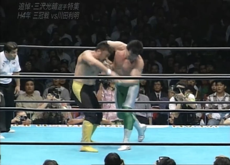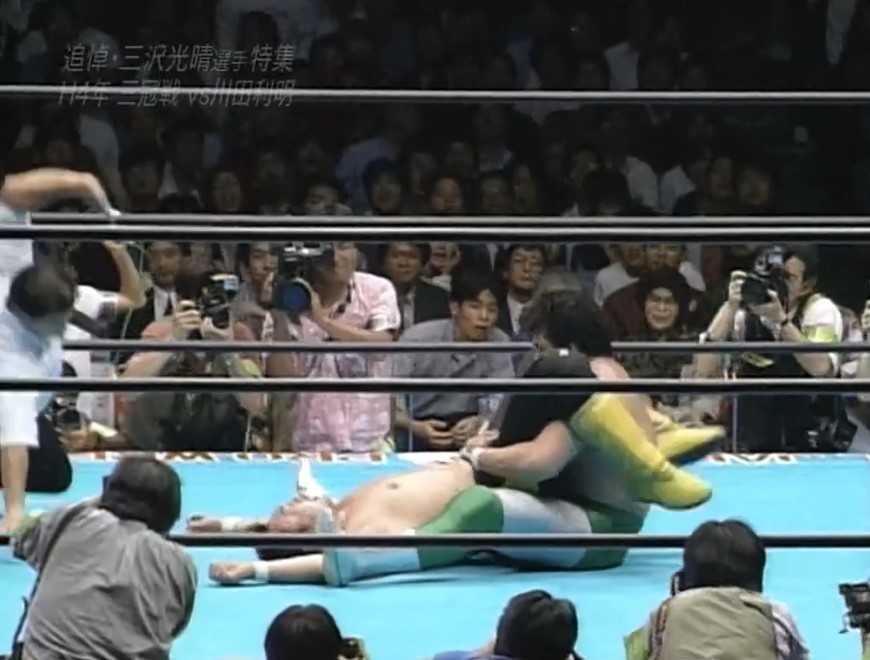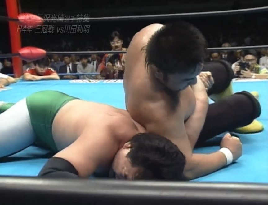 三沢はフェースロックで捕らえ、川田は慌ててロープエスケープするも、三沢は首投げでリングに戻すと再びフェースロックで捕らえ、一旦解いてからカバーし、再びフェースロックで捕らえると、川田はロープエスケープする。