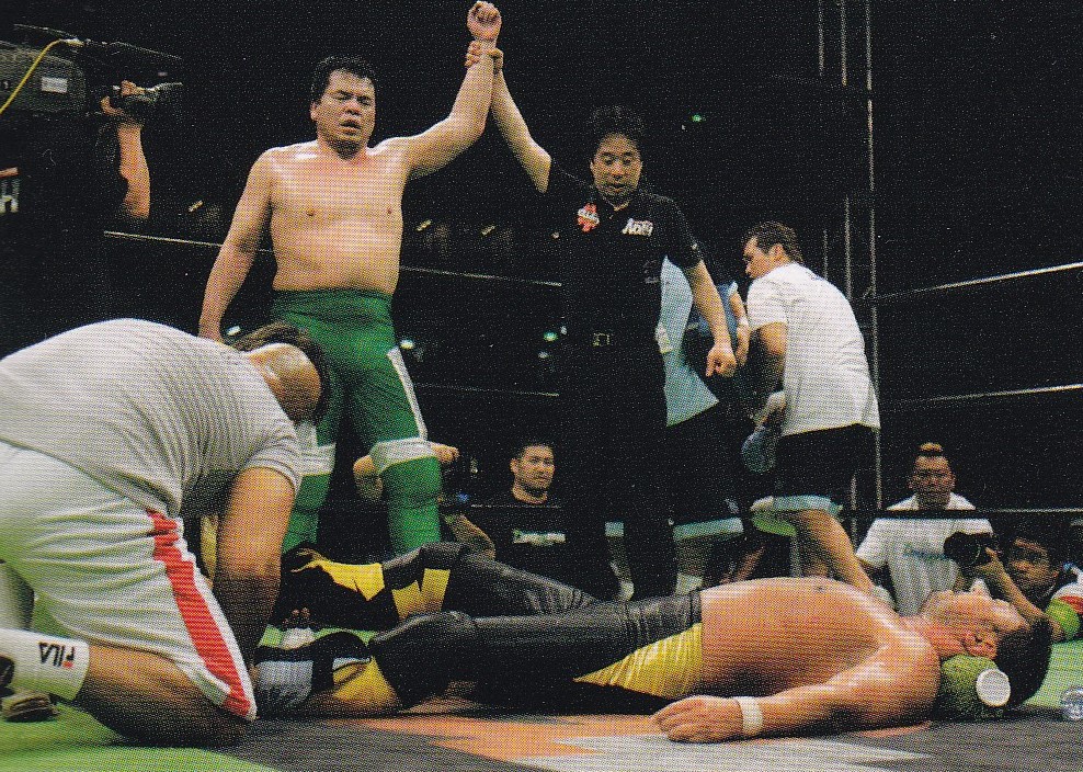 川田は三沢をリングに戻すとラリアットを放ち、顔面へフロントキックを狙うとキャッチした三沢はエルボーを放つも、追撃できない隙を突いた川田はフロントキックで蹴り倒し、読み合いから突進すると避けた三沢はジャーマンスープレックスホールド、タイガードライバーと決めるが、川田はカウント2でキックアウトする。