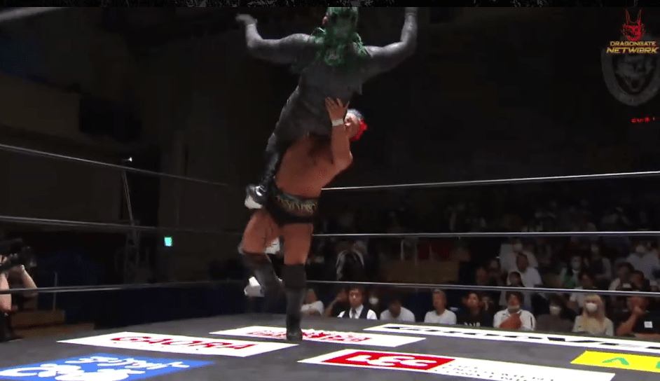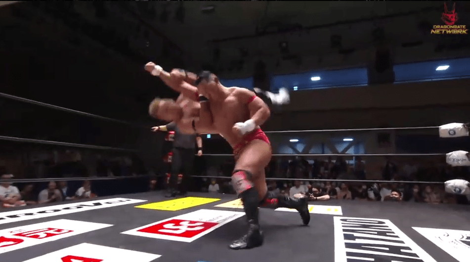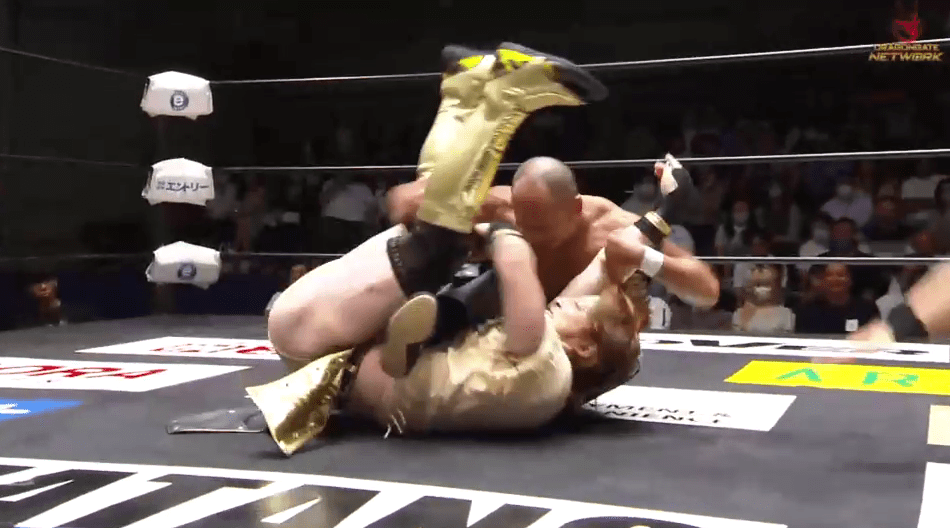 そこでEitaはKzyを無理やりリングに戻してカバーするが、Kzyは無意識だったのかカウント2でキックアウトする。そこでKzyはやっと朦朧としながらも意識を取り戻すが、Eitaは雪崩式ブレーンバスターで投げる。