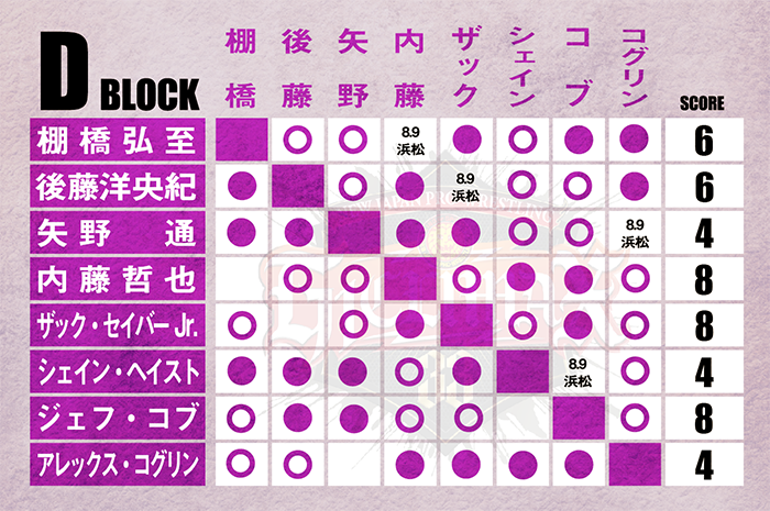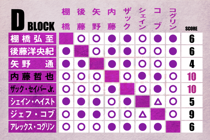 『G1 CLIMAX 33』Dブロックも浜松大会で最終公式戦を迎え、ここまでの経過は内藤、ザック、コブの3選手が並んでトップとなって、わずかながらも棚橋と後藤も可能性を残して追いかける展開となった。