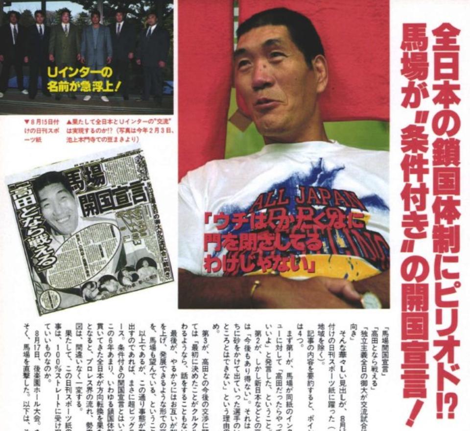 1996年8月15日、日刊スポーツがこれまで鎖国を敷いていた全日本プロレスが一転して開国へと舵を切ったことを報じ、「髙田とならやってもいいよ」と発言したことで、開国へ舵を切った背景には髙田延彦率いるUWFインターナショナルの存在があることを匂わせた。この記事を受けて17日の後楽園ホール大会で馬場が会見を開き「記事については間違ってはいないが、やるとかやらないとかは言っていない。うちはかたくなに門を閉ざしているわけじゃなく、(過去に全日と)問題の無いところとは交流できる。」と条件付きながら開国へと舵を切ったことを認めた。
