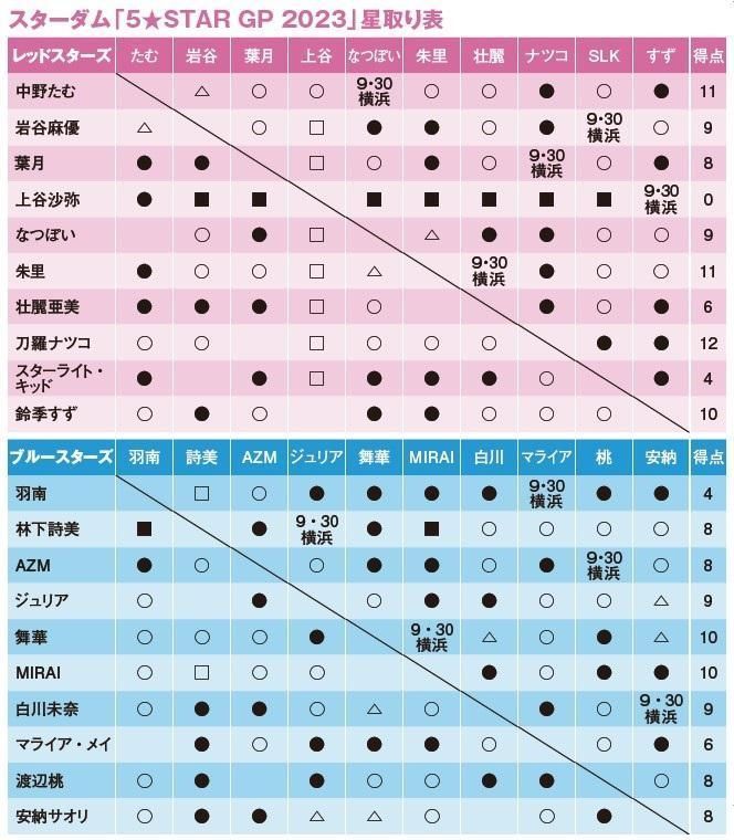 そしてここまでの経過はレッドスターはナツコ、上谷沙弥戦の不戦勝を含めた鈴季すずが12点でトップグループも、中野たむと朱里が1点差で追いかけるが、鈴季すずは全公式戦を終了、ナツコの優勝決定戦進出は葉月戦での勝利が必須となる。