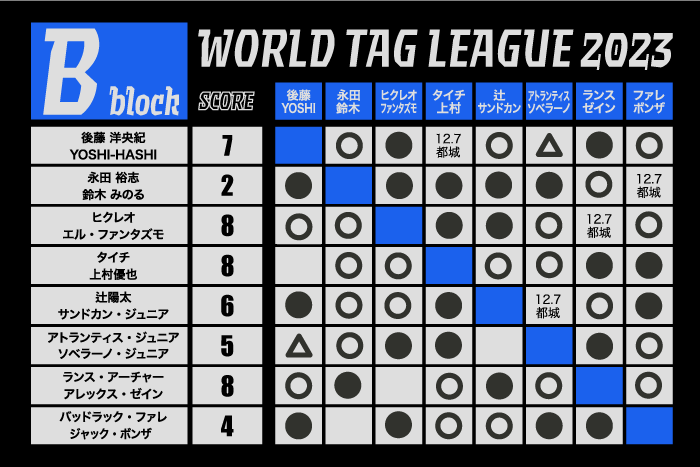 宮崎大会でBブロック公式戦最終公式戦を迎えた『WORLD TAG LEAGUE 2023』、ここまでの経過を振り返ると、ヒクレオ&ファンタズモのG.o.D、アーチャー&ゼインのモンスターソース、タイチ&上村のJUST 5 GUYSがトップ、1点差で後藤&YOSHI-HASHIの毘沙門が追いかけ、辻&サンドカンJr.が自力進出はむいかしい状況なれど、僅かながら可能性を残す展開となった。