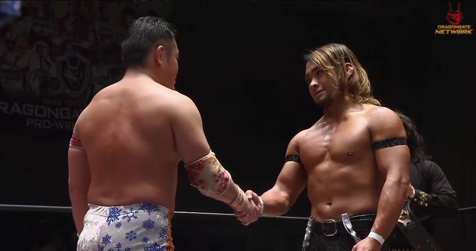 マイクを持ったマサアキが鷹木を呼び止めると、「明日からアメリカへ行くのに来てくれてありがとう。オマエも40歳になって、新日本プロレスでハツラツオジサンと言われて、プロレスを楽しんでいるだろう、DRAGON GATE出身者としてオマエは誇りだよ、あとはうちの若い連中も戦いたいだろうからまた来てくれ、それとリング上で握手した記憶がない、こうして対戦するのも最後かもしれないから握手してくれ」、鷹木も「ありがとうございました」と握手で応じて退場する。「身体がきつくても最後の締めをしなきゃいけない、斎了GMに冠大会にしてくれたことと、観客に感謝、鷹木には引導を渡しに来いといったけど、まだ俺にはやることがある、ジュニアの一本立ちとシングルもある、明日は鷹木と比べたらKAI、ISHINはまだまだ子供でしょう、明日はM3K大復活を見せる、デビュー30周年で団体と、使ってくれる団体、家族両親に感謝、ジュニアにも身体を直せ「と檄を飛ばし、「DRAGON GATE2024年1年今年もよろしくお願いします。」で締めくくり、最後の一仕事としてサイン会へと向かった。
