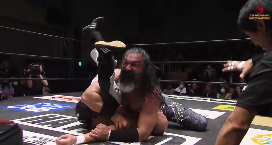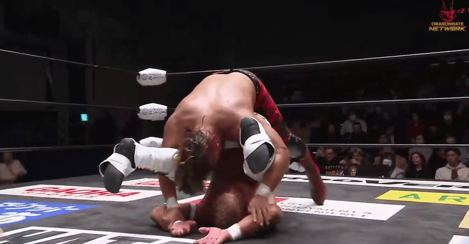 マサアキはビンタで応戦すると、マサアキのラリアットとパンピングボンバーが相打ち、マサアキがビンタから三角蹴りを命中させても、鷹木がパンピングボンバーで応戦する。