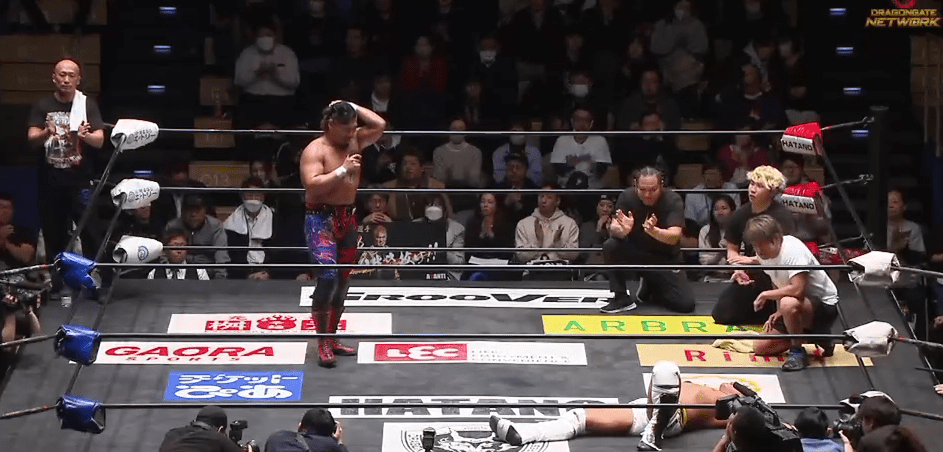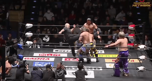 ぶつかり合いになると、マサアキがローキックに対し、鷹木がエルボーからダブルチョップで返すが、、突進はマサアキがエプロンに鷹木を出すと、ロープ越しのサッカーボールキックで場外へ落とし、トペマサアキを命中させたが富永を巻き込んでしまう。