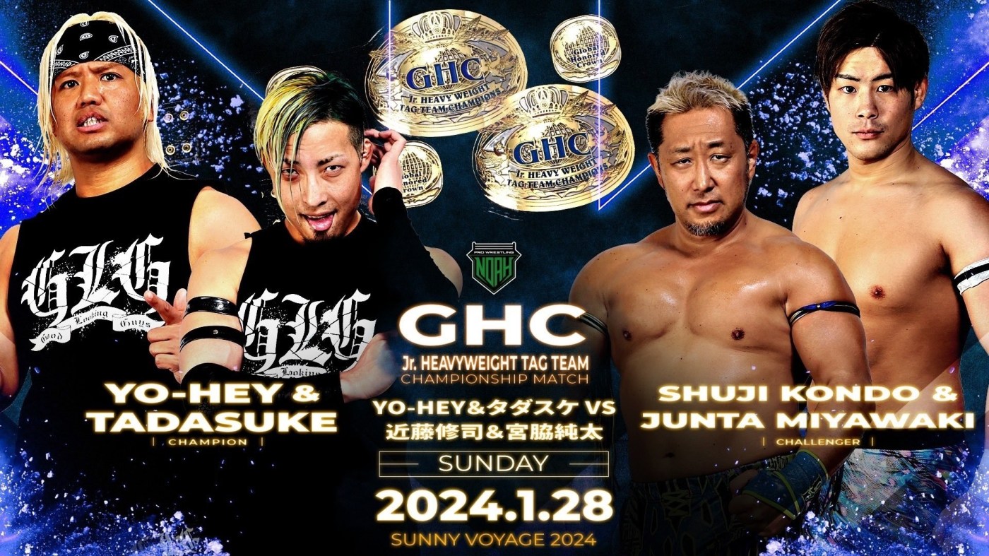 NOAH大阪大会でGHCジュニアタッグ選手権が行われ、王者のタダスケ&YO-HEYに近藤&宮脇が挑戦した。