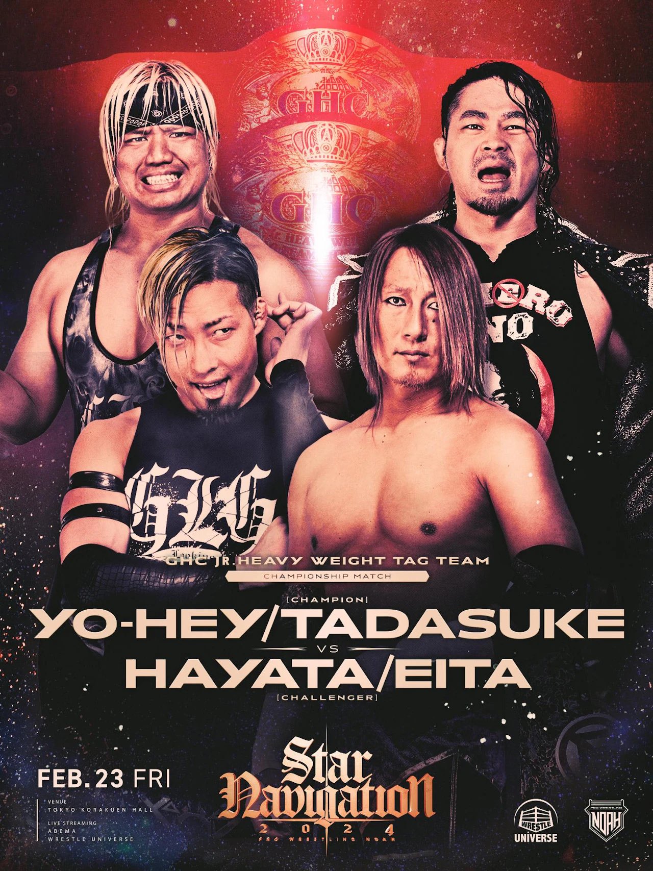NOAH後楽園大会のメインはGHCジュニアタッグ選手権、王者のタダスケ&YO-HEYのGLGにHAYATA&Eitaが挑戦、HAYATAは過去GHCジュニアタッグ王座を戴冠して、小川とのコンビで長期政権を築けば、EitaはGHCジュニアタッグだけでなく、DRAGON GATEではツインゲート、トライアングルゲートも戴冠するなど、シングルだけでなく、タッグでも実績を誇っており。また前哨戦シングル4番勝負でもHAYATA&Eitaが全勝するなど、タダスケ&YO-HEYにとって最強の挑戦者チームを迎えた。