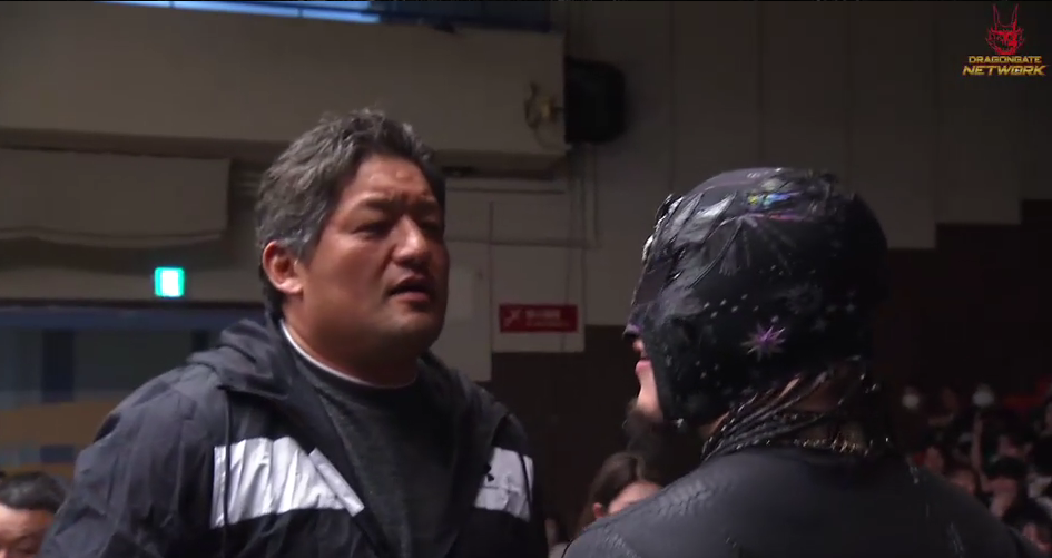 試合後に土井が優勝をアピールするが、いきなり解散を宣言をしたため、キッドは待ったをかけ、HUGを要求、土井も「もう少しやろうか」と気を取り直し、やることが一つとしてツインゲートをDRAGON GATEに戻すと言ったところで、ツインゲート王者でNOAHの清宮海斗&アレハンドロが登場する。
