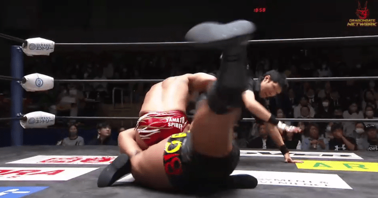 キッドはYAMATOにソバットから619を狙うが、キャッチしたYAMATOが両脚ドラゴンスクリュー、逆片エビ固めからSTFと足攻めでキッドを捕らえ、ススムも本家足横須賀から足四の字でキッドを追い詰める。