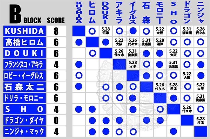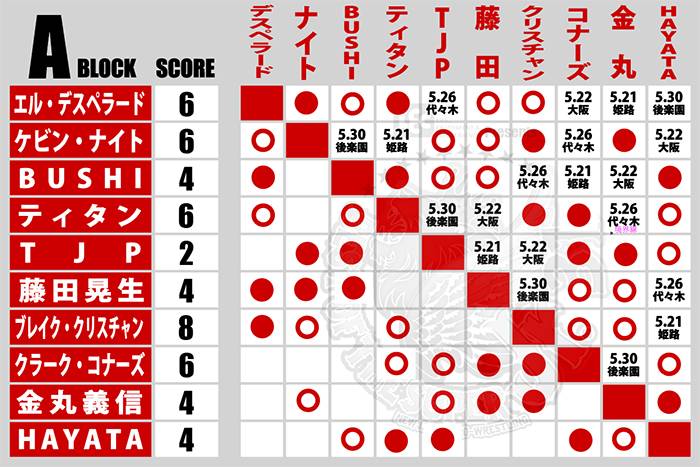 そして名古屋大会を終えての経過は、Aブロックはクリスチャンが単独トップは変わらず、それをデスペラードとケビン、ティタンとコナーズが追いかけ、BブロックはKUSHIDAが単独トップで、ヒロムとDOUKI、ロビーと石森、モロニーが追いかける混戦となった。