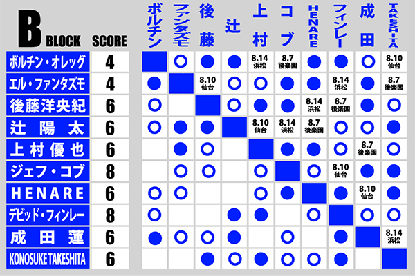 Bブロックも残り2戦となり、フィンレーとコブが並んでトップ、それを後藤、辻、上村、HENARE、成田、TAKESHITAが追いかける混戦となったが、後藤は次戦の相手はフィンレー、後藤がまだまだ頑張って夏を終わらせないでほしい。