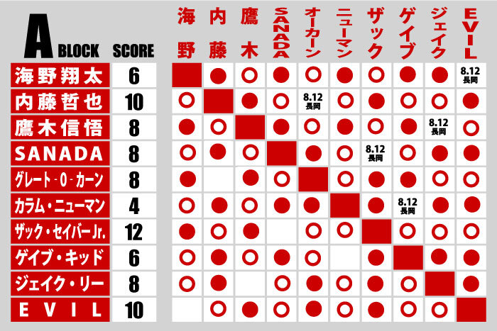 Aブロックは残り1戦だけとなり、ザックはブロック突破を決めたことから、残り2枠を内藤、EVIL、鷹木、SANADA、O・カーン、ジェイクの間で争われることになった。長岡では内藤vsO・カーン、EVILvs海野、鷹木vsジェイク、SANADAvsザックが組まれているが、SANADAがここにきて右膝を負傷してしまったことから、ザック戦でどう影響を及ぼすのか…