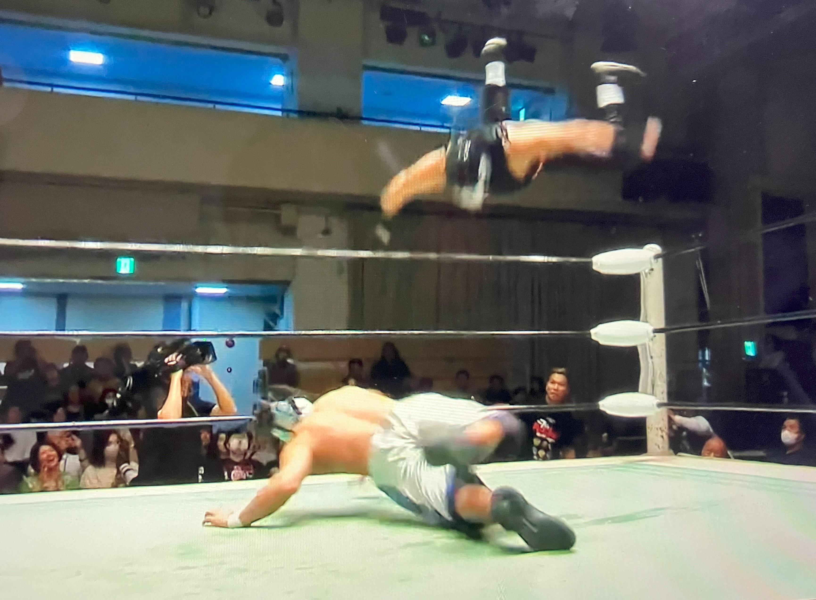 ジャックはヘッドロックで捕らえると、変則的な動きでジャックを翻弄したナギナタはジャックと一緒に欽ちゃんジャンプ、人工衛星ヘッドシザースホイップでジャックを場外へ出す。