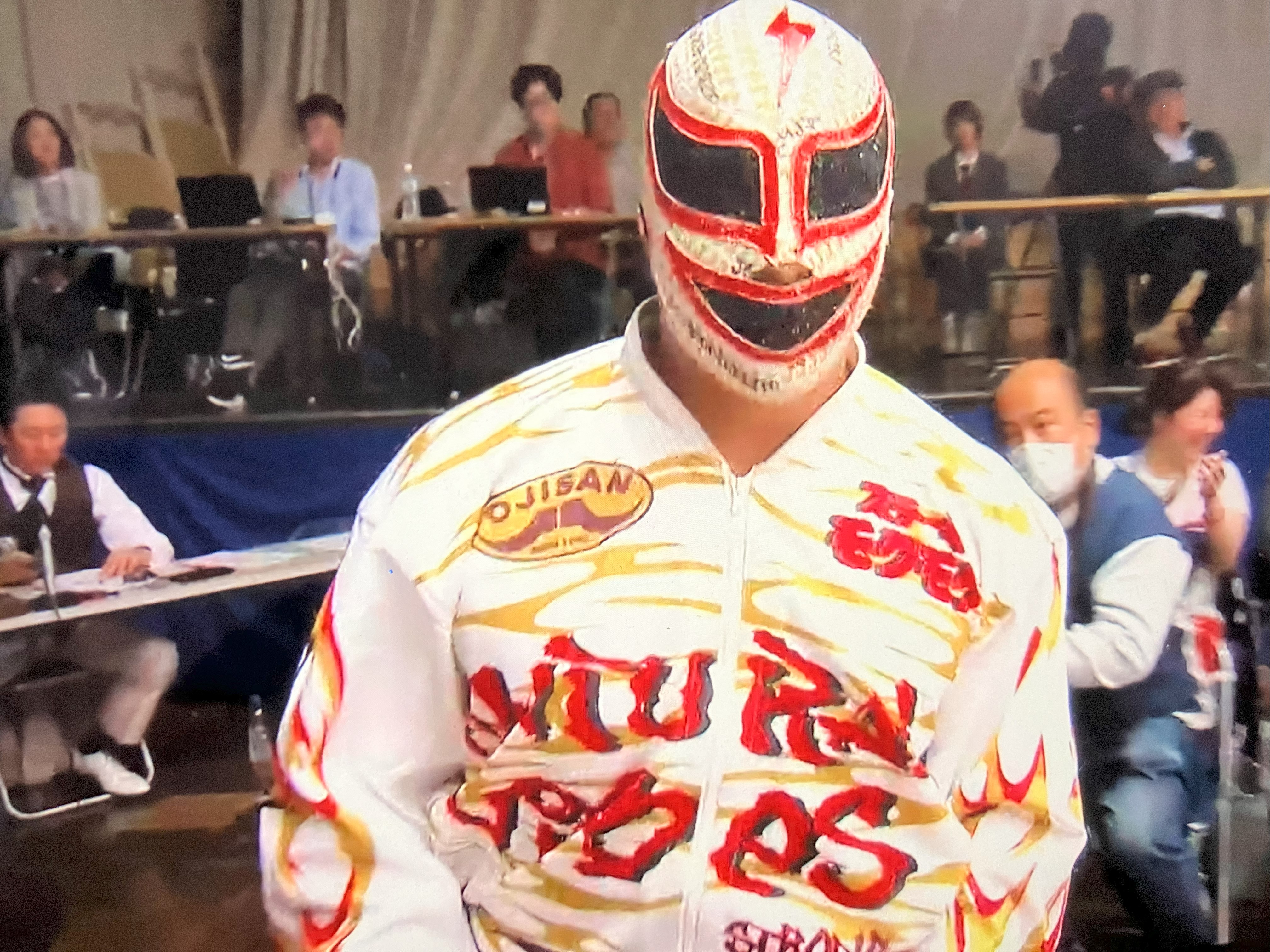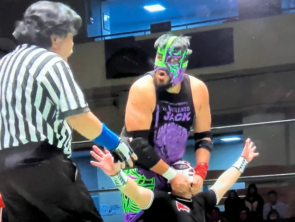 ナギナタのエルボーを受け流したジャックは逆水平から腕固め、ジャベ式アームバーから押さえ込み、串刺しラリアットを狙うが、避けたナギナタがドロップキックからジャックのマスクを剥ぎにかかり、レフェリーが反則カウントで止めるも、ナギナタは読み合いから延髄斬り、場外へ逃れたジャックにプランチャを命中させる。